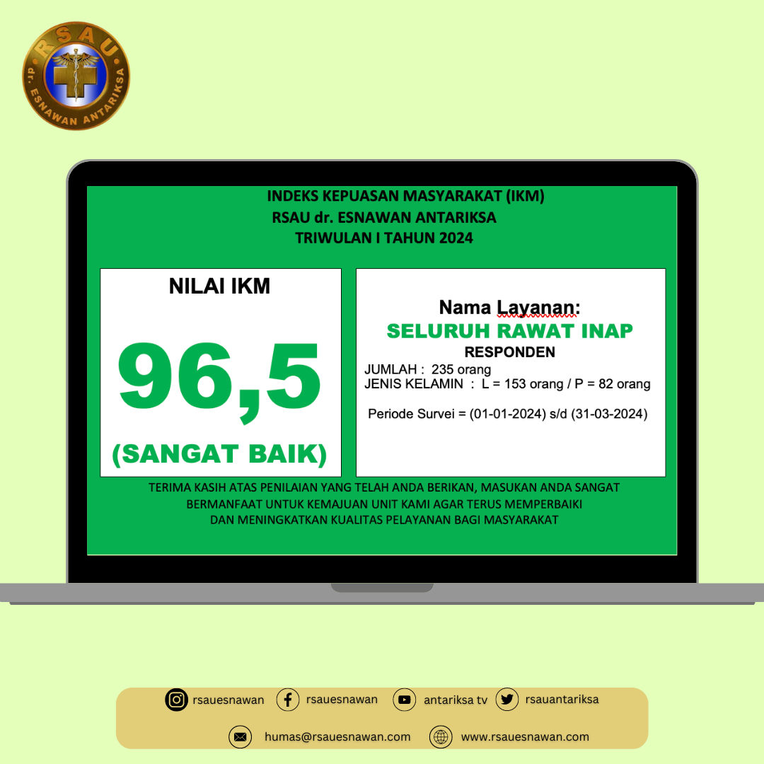 Kami mengucapkan Terima Kasih atas penilain terhadap pelayanan kami. Masukan anda sangat bermanfaat bagi Seluruh Unit di RSAU dr. Esnawan Antariksa agar terus berkembang, meningkatkan, serta memperbaiki kualitas Pelayanan.